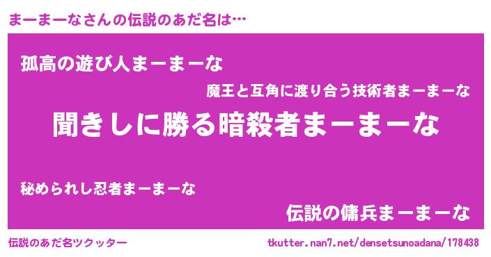 | 男性向けラノベタイトル風あだ名 | 『まーまーなという概念が存在しない退屈な世界 』 |