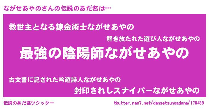 | 男性向けラノベタイトル風あだ名 | 『ながせあやの~年齢イコール彼女いない歴の魔法使い~』 |