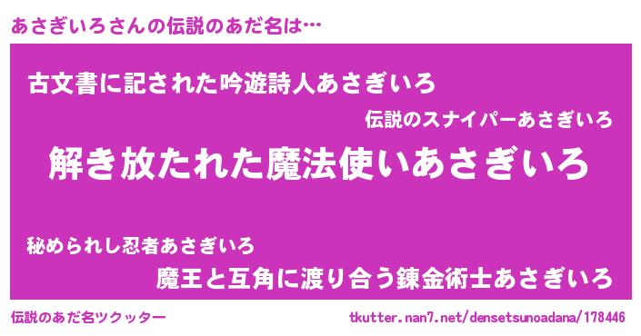 | 意味不明あだ名 | 『とにかく怪しいあさぎいろ』 |