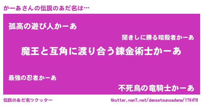 | 男性向けラノベタイトル風あだ名 | 『おまえをオタクにしてやるから、俺をかーあにしてくれ! 』 |