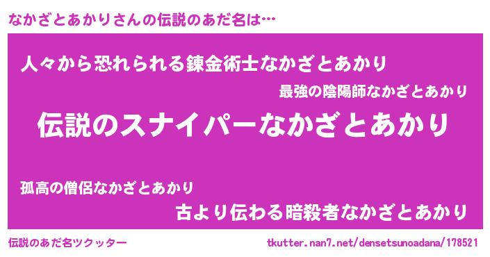 | 意味不明あだ名 | 『住所不定無職なかざとあかり(71歳)』 |
