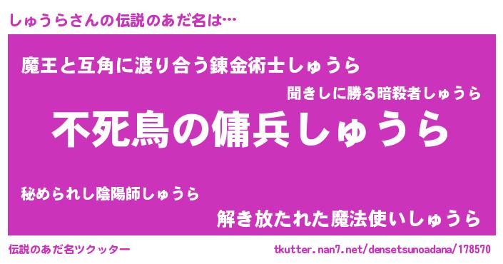 | 意味不明あだ名 | 『ペロリンしゅうら』『自称しゅうら』 |