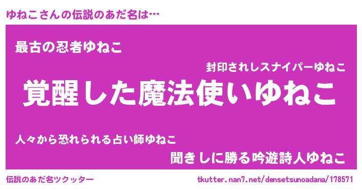 | ヒーロー風カッコイイあだ名 | 『幻影騎士ユネ』『ウルトラゆねこマン』 |