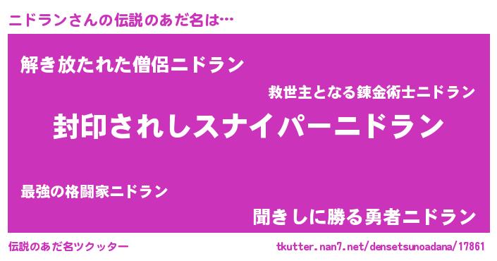 | 意味不明あだ名 | 『住所不定無職ニドラン(91歳)』 |