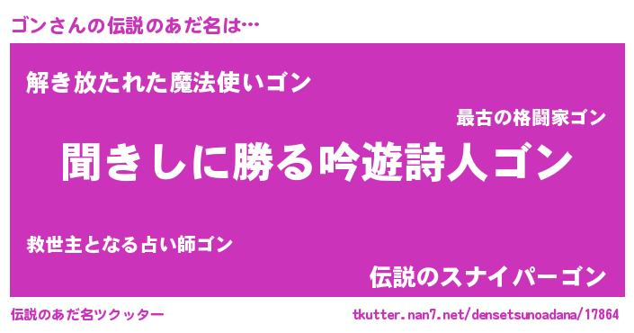 | 男性向けラノベタイトル風あだ名 | 『魔弾の王とゴン』『ゴンスレイヤー』 |