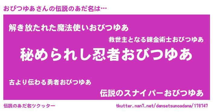 | 意味不明あだ名 | 『住所不定無職おびつゆあ(53歳)』 |