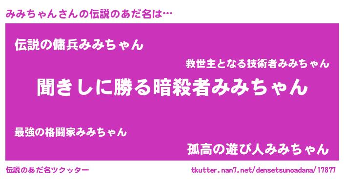 | 女子向けラノベタイトル風あだ名 | 『異世界で失敗しない100のみみちゃん』 |
