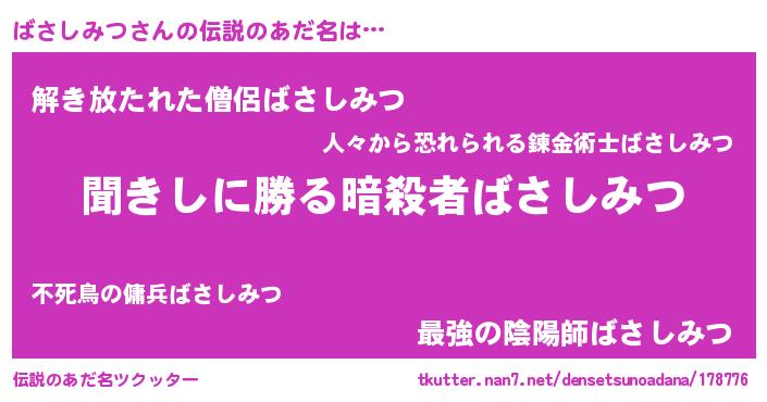 | 意味不明あだ名 | 『永久保存ばさしみつ』『自称ばさしみつ』 |