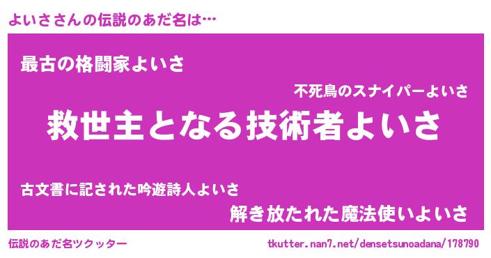 | 女子向けラノベタイトル風あだ名 | 『死神よいさの再婚』『よいさ伯爵の花嫁』 |