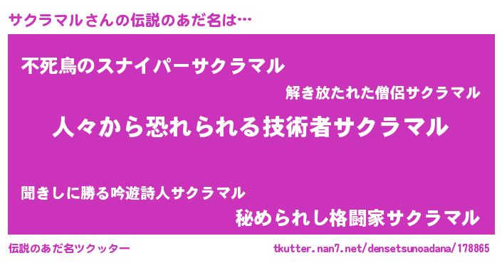 | 女子向けラノベタイトル風あだ名 | 『サクラマル夫妻のなれそめ』 |