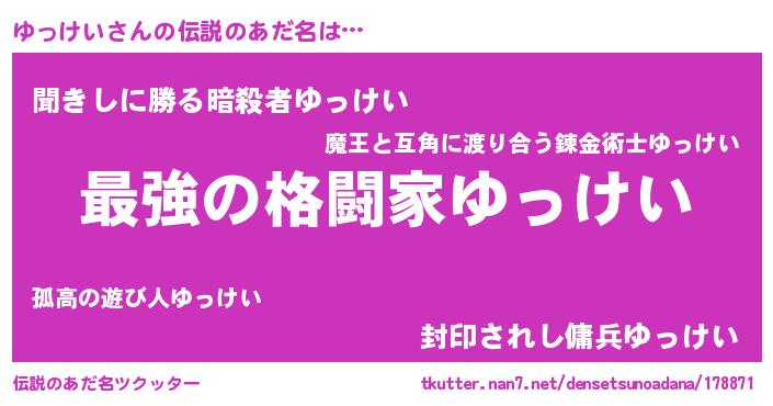 | 意味不明あだ名 | 『住所不定無職ゆっけい(10歳)』 |