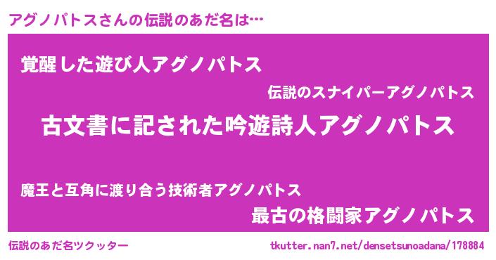 | 意味不明あだ名 | 『住所不定無職アグノパトス(5歳)』 |