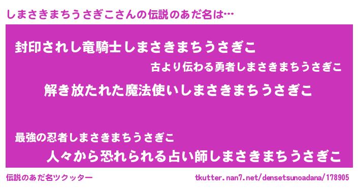 | 女子向けラノベタイトル風あだ名 | 『しまさきまちうさぎこの卵を拾いまして』 |