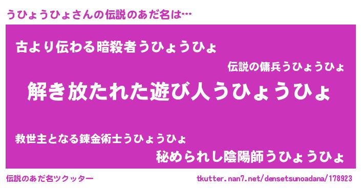| ヒーロー風カッコイイあだ名 | 『魔戒騎士ウヒ』『ネオウヒョウヒョ』 |
