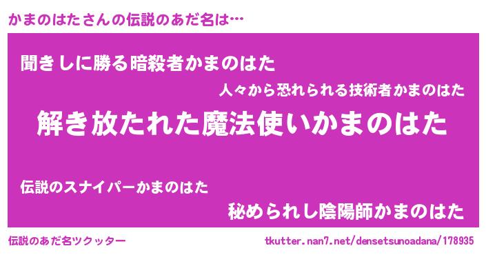 | 男性向けラノベタイトル風あだ名 | 『かまのはたの嫁は女の子じゃないと思った?』 |