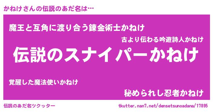 | 胡散臭い通販商品みたいなあだ名 | 『必ず成功する霊験あらたかなお札…その名も「かねけ」』 |