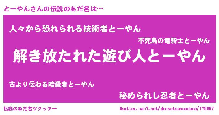 | ヒーロー風カッコイイあだ名 | 『幻影騎士トー』『仮面トーダー』 |