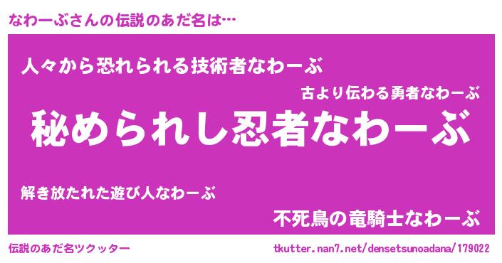 | 意味不明あだ名 | 『なわーぶフォーエバー』『自称なわーぶ』 |