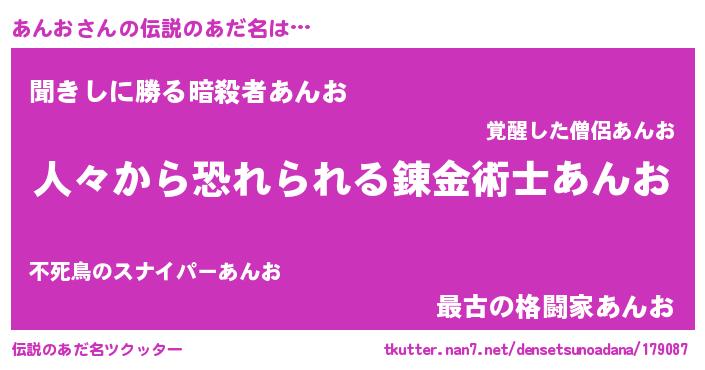 | 意味不明あだ名 | 『住所不定無職あんお(98歳)』『自称あんお』 |