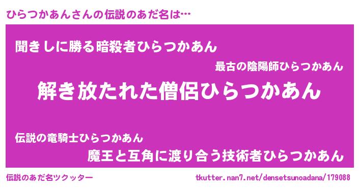 | 男性向けラノベタイトル風あだ名 | 『ダンジョンにひらつかあんを求めるのは間違っているだろうか』 |