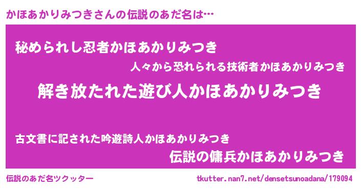 | 女子向けラノベタイトル風あだ名 | 『かほあかりみつきの卵を拾いまして』 |