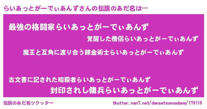 | 意味不明あだ名 | 『住所不定無職らいあっとがーでぃあんず(71歳)』 |