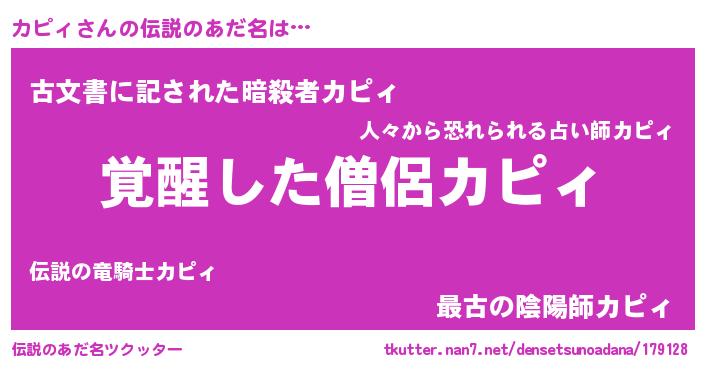 | 男性向けラノベタイトル風あだ名 | 『カピィの嫁は女の子じゃないと思った?』 |