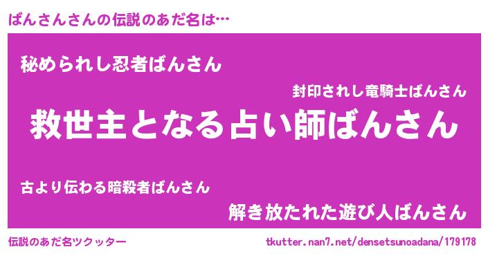 | ヒーロー風カッコイイあだ名 | 『慈愛の使者ばんさん』『黄金騎士バン』 |
