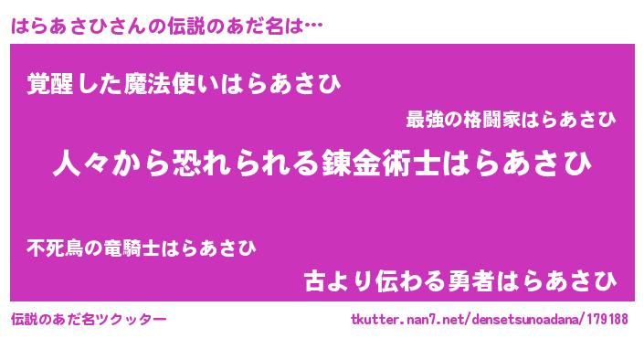 | 意味不明あだ名 | 『自称はらあさひ』『永久保存はらあさひ』 |
