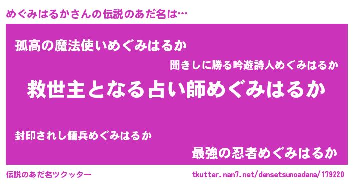 | 男性向けラノベタイトル風あだ名 | 『めぐみはるか~年齢イコール彼女いない歴の魔法使い~』 |