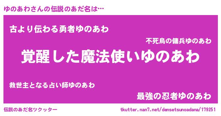| 男性向けラノベタイトル風あだ名 | 『ゆのあわの嫁は女の子じゃないと思った?』 |