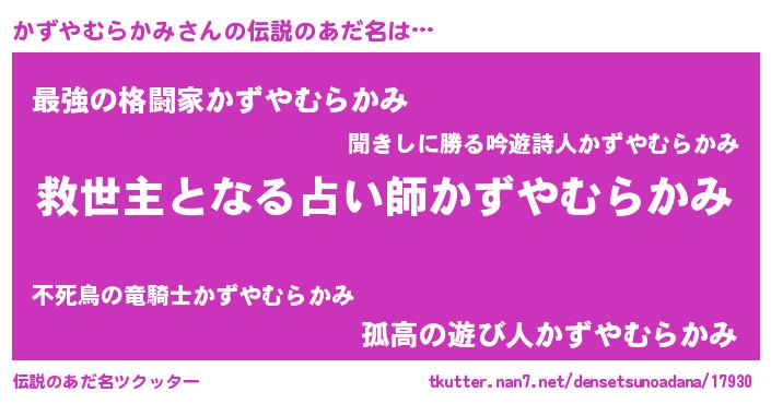 | 男性向けラノベタイトル風あだ名 | 『かずやむらかみ~年齢イコール彼女いない歴の魔法使い~』 |