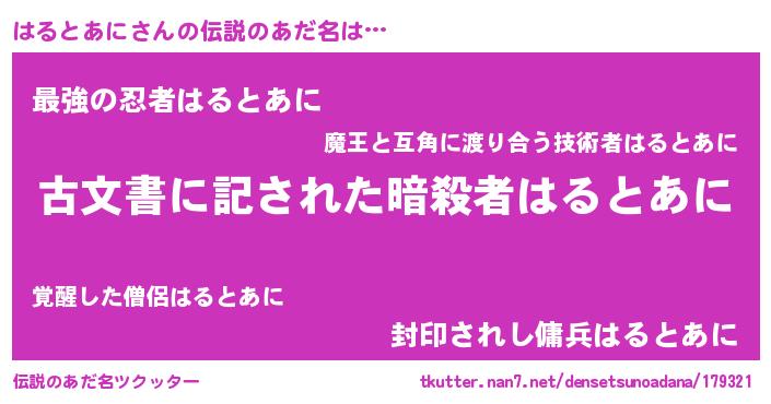 | 意味不明あだ名 | 『ヨモギ科はるとあに属』 |