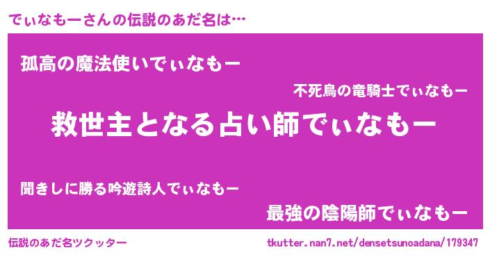 | ヒーロー風カッコイイあだ名 | 『天空の使者でぃなもー』『魔戒騎士ディ』 |