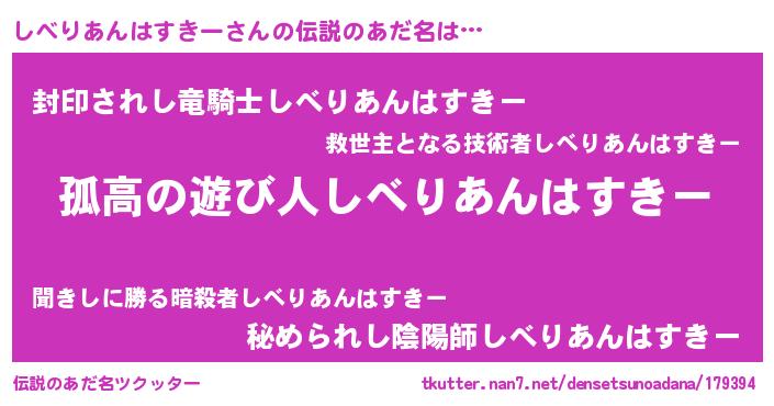 | 意味不明あだ名 | 『とにかく怪しいしべりあんはすきー』 |