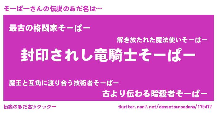 | 意味不明あだ名 | 『自称そーぱー』『ペロリンそーぱー』 |