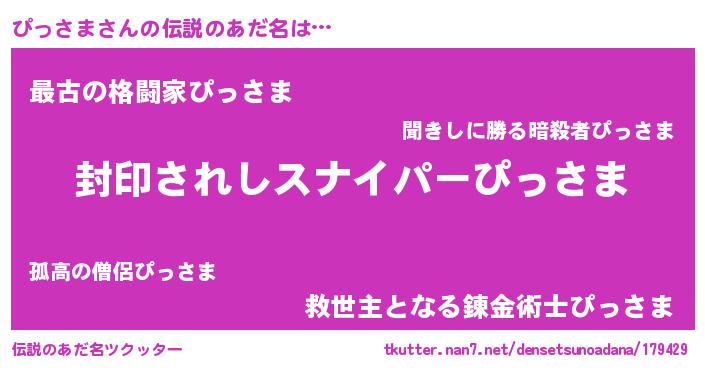| 男性向けラノベタイトル風あだ名 | 『Re:ぴっさまから始める異世界生活』 |