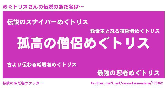 | 男性向けラノベタイトル風あだ名 | 『メグトリススレイヤー』 |
