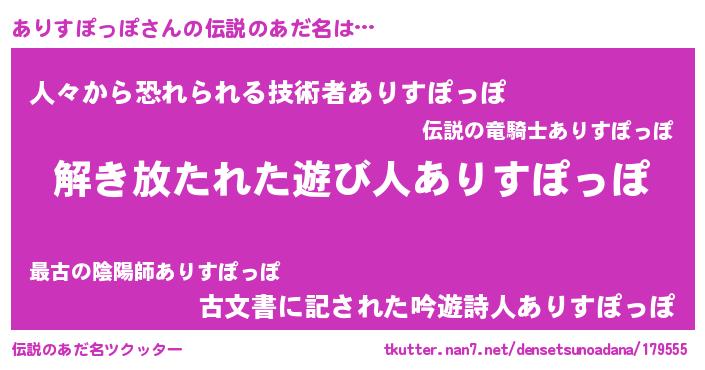 | 意味不明あだ名 | 『とにかく怪しいありすぽっぽ』 |