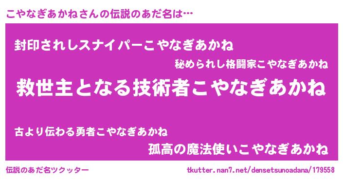 | 男性向けラノベタイトル風あだ名 | 『こやなぎあかねに滅ぼされるだけの簡単なお仕事です』 |