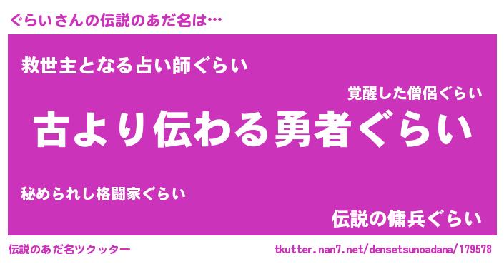 | 胡散臭い通販商品みたいなあだ名 | 『来世でも幸せになれる水素水…その名も「ぐらい」』 |