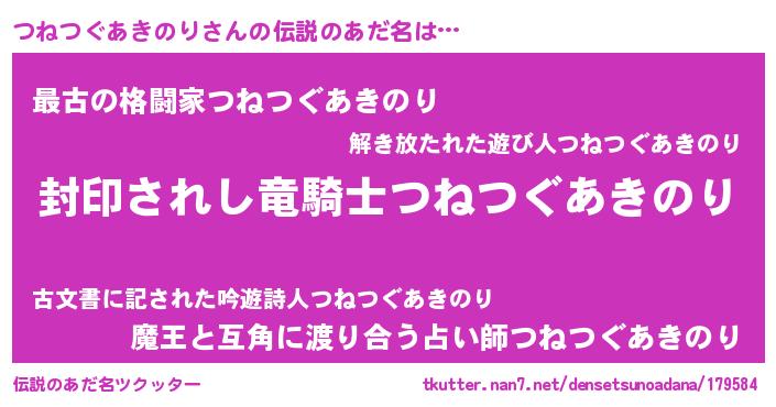 | 男性向けラノベタイトル風あだ名 | 『ツネツグアキノリアートオンライン』 |