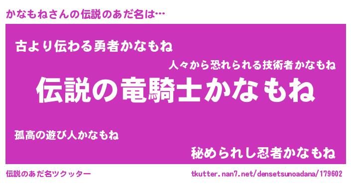 | 男性向けラノベタイトル風あだ名 | 『カナモネスレイヤー』 |