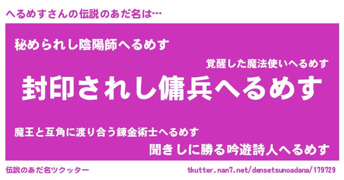 | 意味不明あだ名 | 『自称へるめす』『ペロリンへるめす』 |