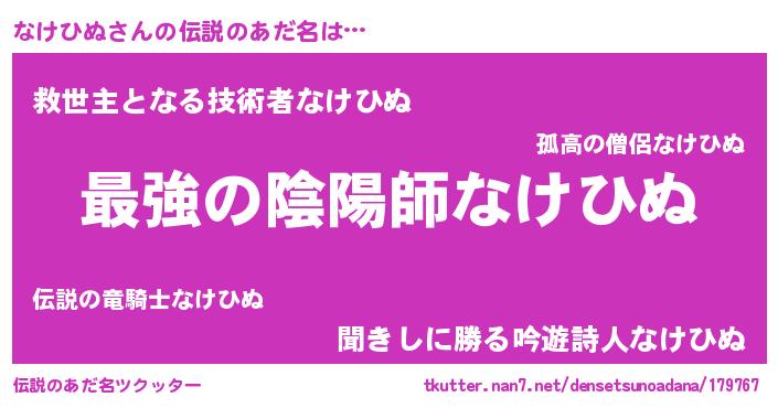 | ヒーロー風カッコイイあだ名 | 『ウルトラなけひぬマン』『ネオナケヒヌ』 |
