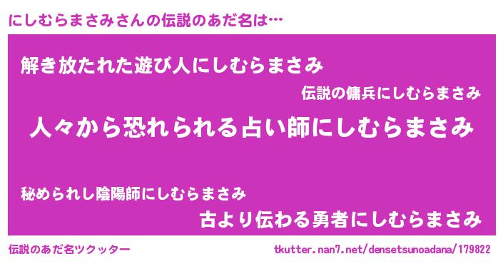 | 意味不明あだ名 | 『住所不定無職にしむらまさみ(59歳)』 |