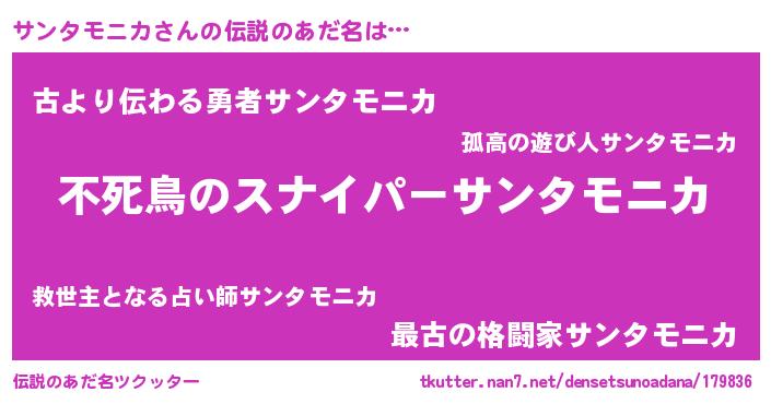 | ヒーロー風カッコイイあだ名 | 『スーパーサンタモニカ』『炎刃騎士サン』 |