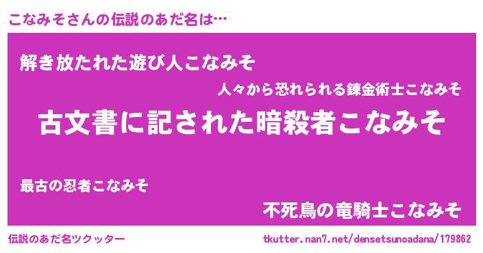 | 男性向けラノベタイトル風あだ名 | 『こなみそ~年齢イコール彼女いない歴の魔法使い~』 |