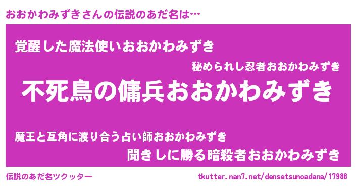 | 男性向けラノベタイトル風あだ名 | 『この素晴らしい世界におおかわみずきを!』 |