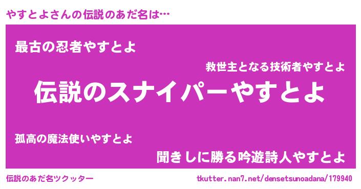| 男性向けラノベタイトル風あだ名 | 『緋弾のヤストヨ』『魔弾の王とやすとよ』 |